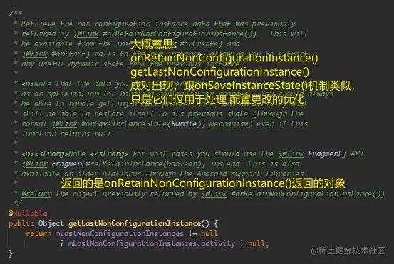 就是Activity除了提供 onSaveInstanceState() 和 onRestoreInstanceState() 外,还另外提供了两个方法 onRetainNonConfigurationInstance() 和 getLastNonConfigurationInstance() 专门处理配置更改。