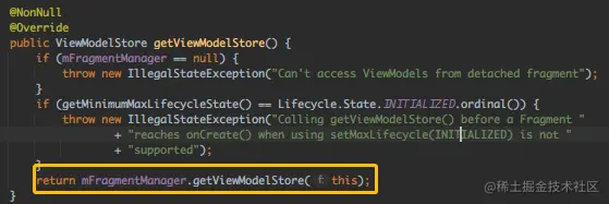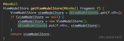 Fragment 内部持有一个 FragmentManagerViewModel 实例,点进去它的 getViewModelStore() 方法: