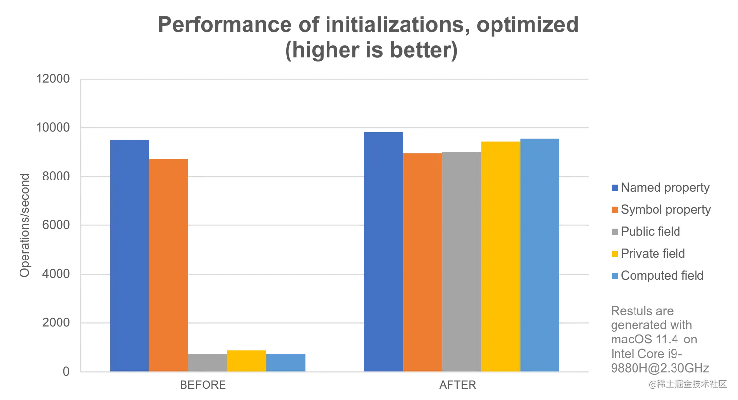 Before v9.7, V8 always used a costly runtime call for class field initializations. With v9.7, when V8 considers the pattern of the initialization to be predictable enough, it uses a new IC to speed up the operation just like what it does for assignments of ordinary properties.