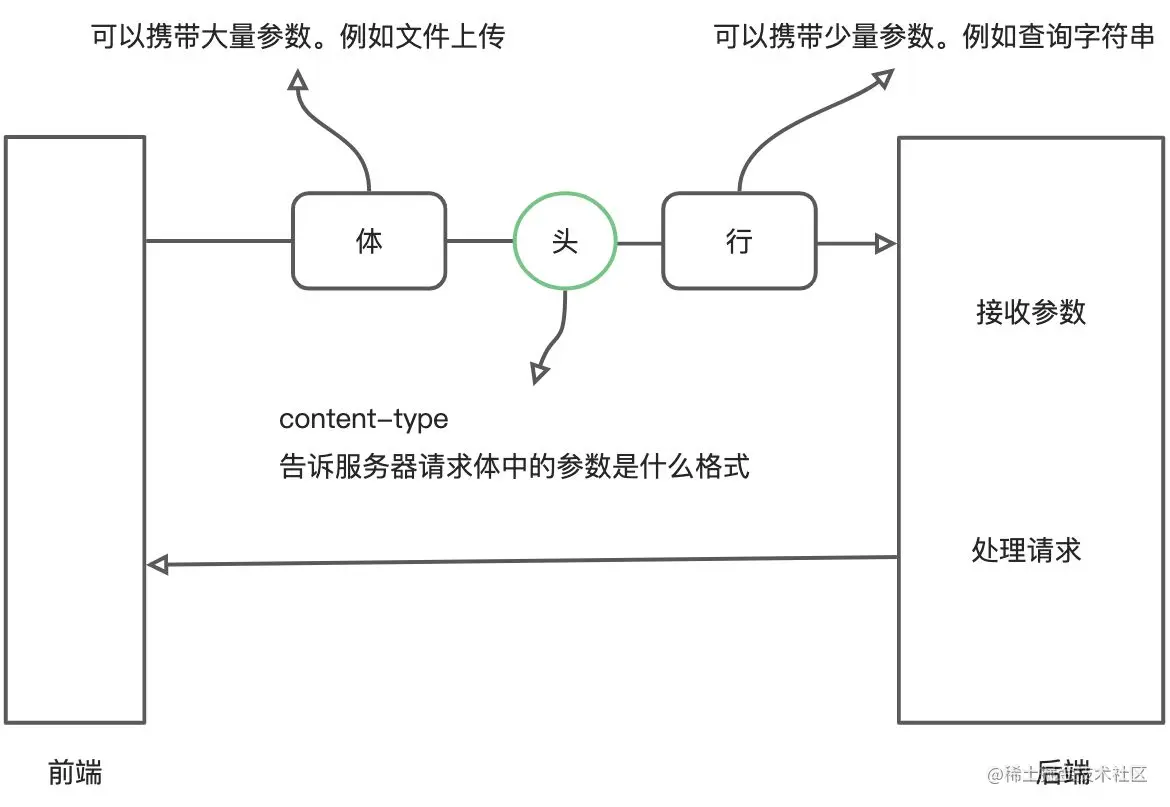 - 请求体: 本次请求携带的参数。至于这些参数到了后端应该如何解析出来,由请求头中的content-type来决定。