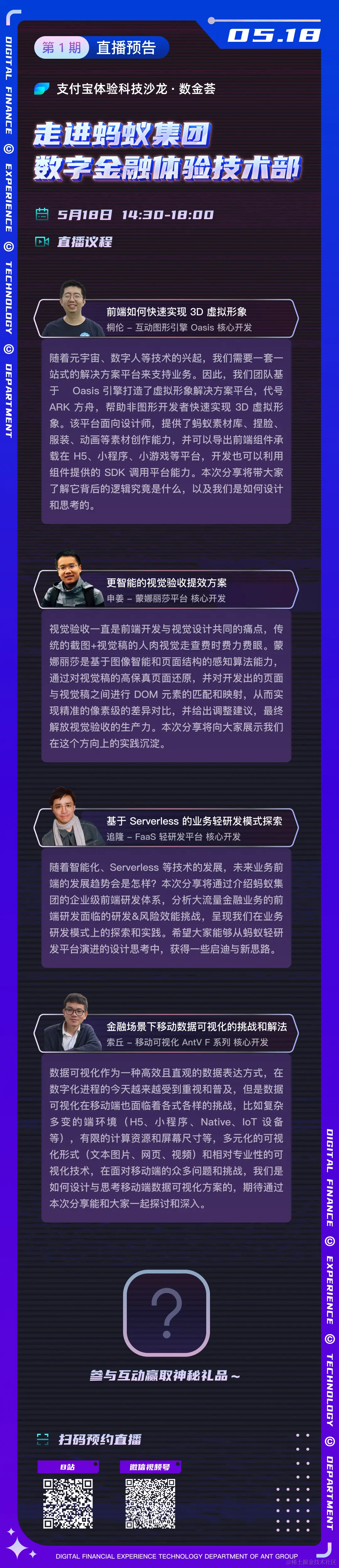 5月18日,预定你了! 支付宝体验科技 2022-04-29 250 阅读1分钟 🙋🏻♀️ 编者按:支付宝体验科技沙龙由蚂蚁集团终端技术委员会出品,每期将邀请蚂蚁集团等业界领域技术专家,分享他们在一线的实战经验与思考。 5 月 18 日,第 1 期支付宝体验科技沙龙 · 数金荟即将启动,本期沙龙将通过线上直播的方式,带你走进蚂蚁集团数字金融体验技术部。 本次分享中,四位蚂蚁集团前端工程师将分享他们在前端的探索与实践,以及面临的挑战与解法,覆盖基础工程、前沿科技等领域,期待与你深度交流~ 话不多说,上预告👇