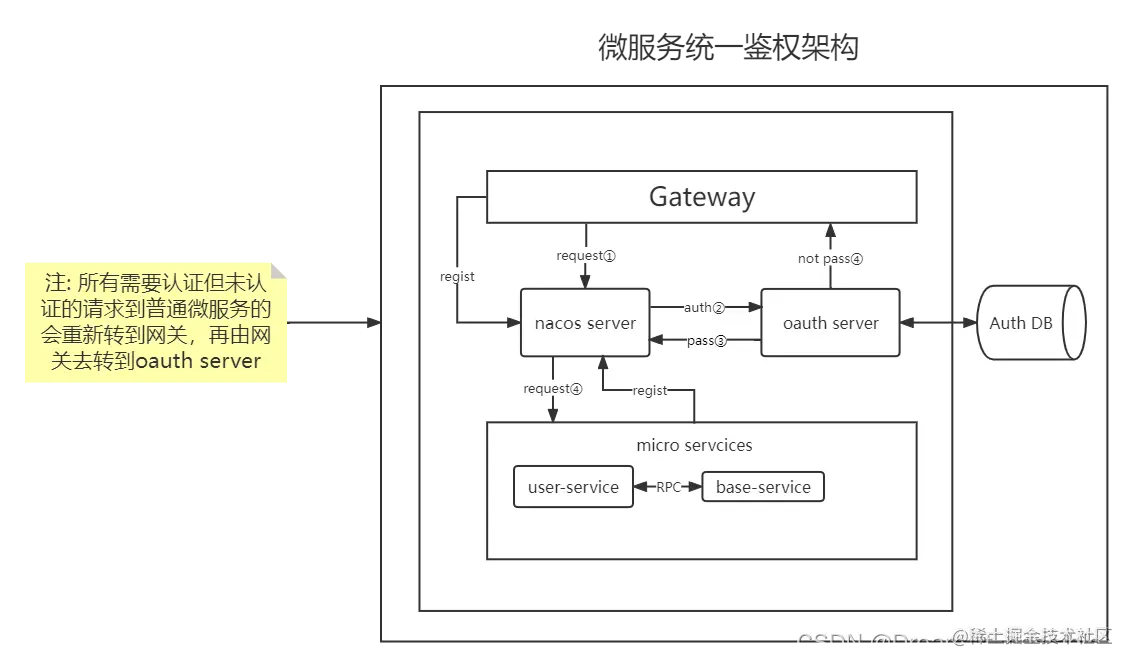 在一个大型的分布式系统里,存在的微服务可能有几十个或者上百个,如何使用网关和oauth server来保护,我们可以将普通微服务的未认证的请求全部由网关转发给鉴权服务器。