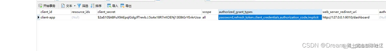 `authorized_grant_types` varchar(256) CHARACTER SET utf8 COLLATE utf8_general_ci NULL DEFAULT NULL COMMENT '客户端支持的grant_type',