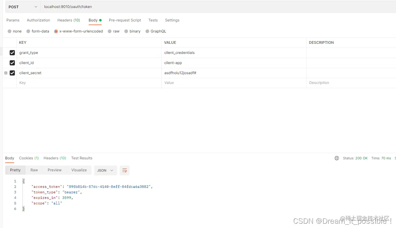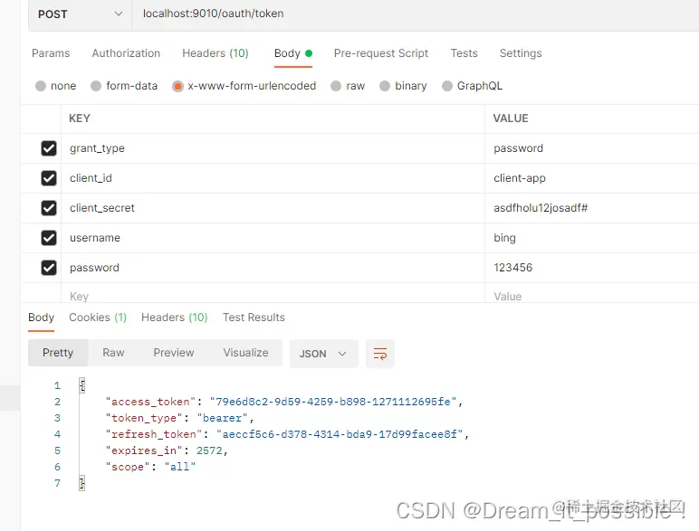 用postman请求localhost:9010/oauth/token, body里的参数为: