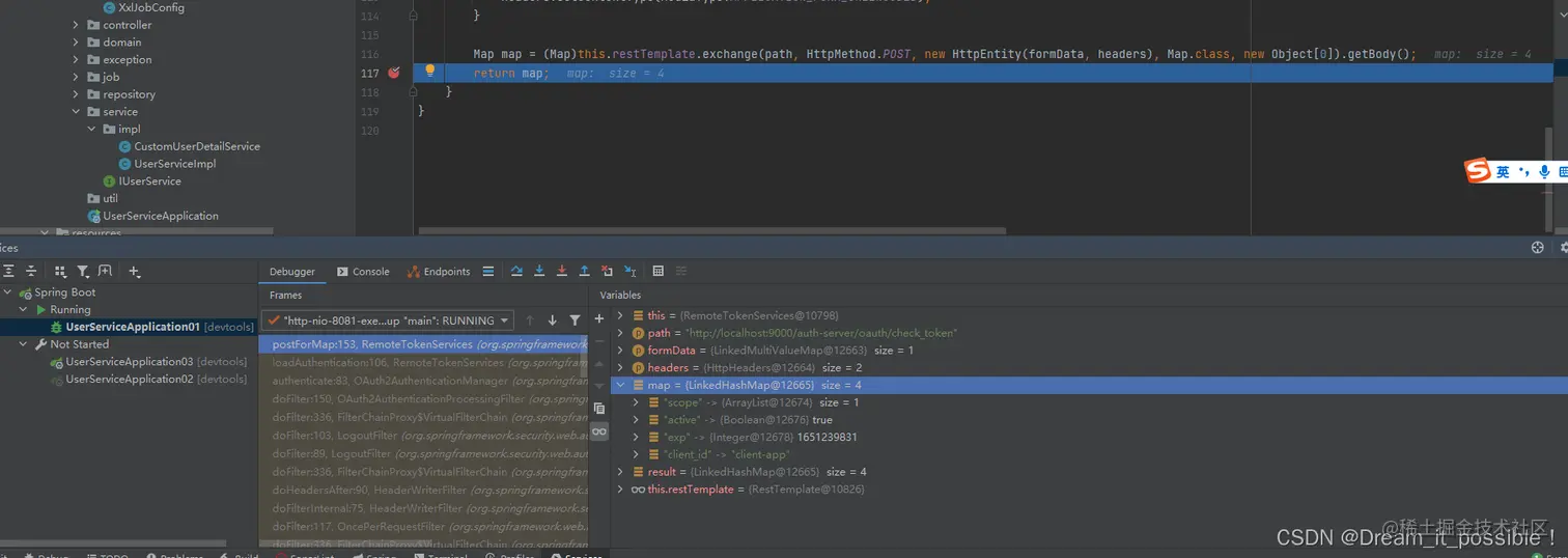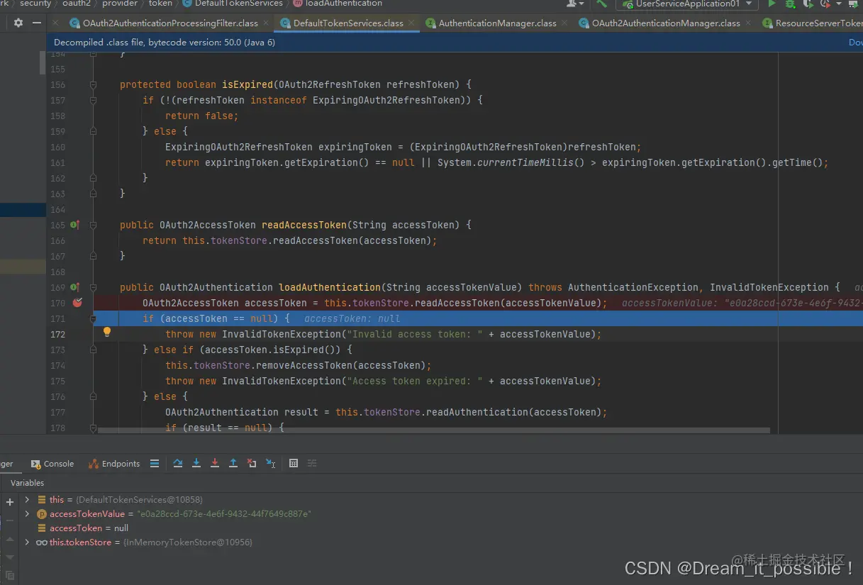 可以发现默认是进入到DefaultTokenService认证token的,我们可以推断出肯定是不行的,因为我在user-service的项目里没有配置授权服务器,简单讲user-service是没有授权功能的。