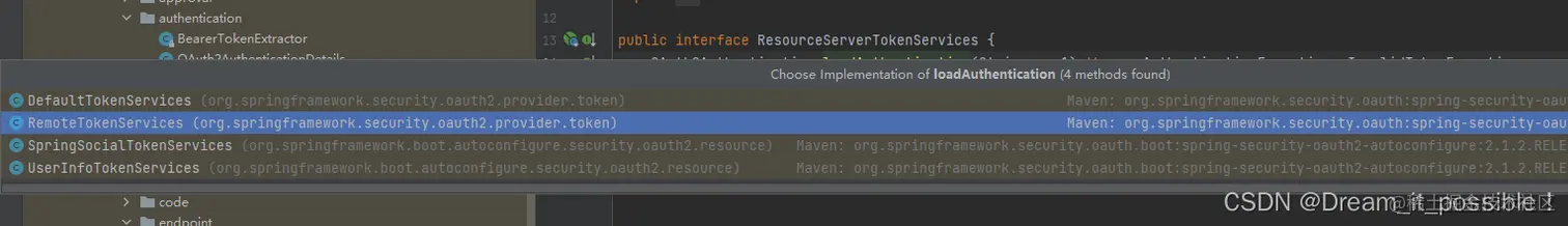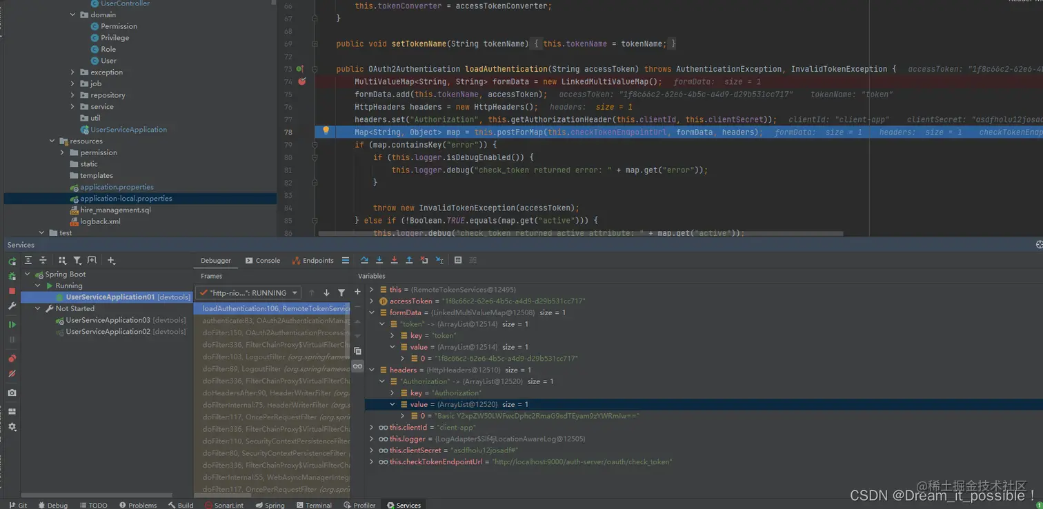 接着我们把注释的配置放开,然后进入到loadAuthentication方法,发现是通过RemoteTokenServices调用的,向我们配置的security.oauth2.resource.token-info-uri 地址发起了一个rest请求:
