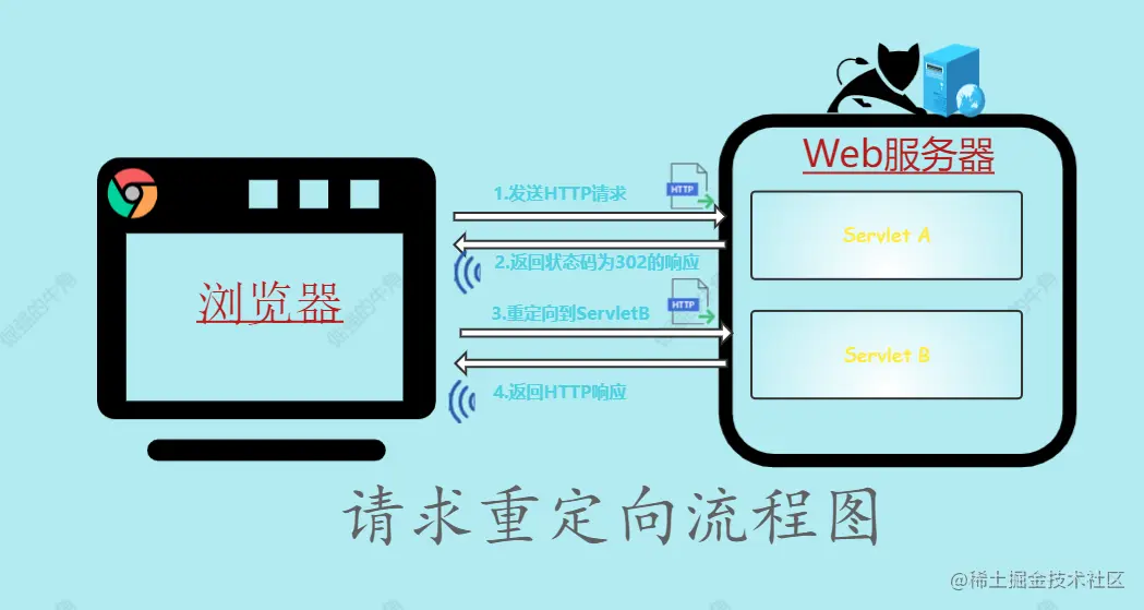 ServletA现在无法处理该请求,它就会给浏览器响应一个302的状态码和一个访问ServletB的location - 浏览器接收到302响应状态码就会重新发送请求到location对应的访问地址去访问