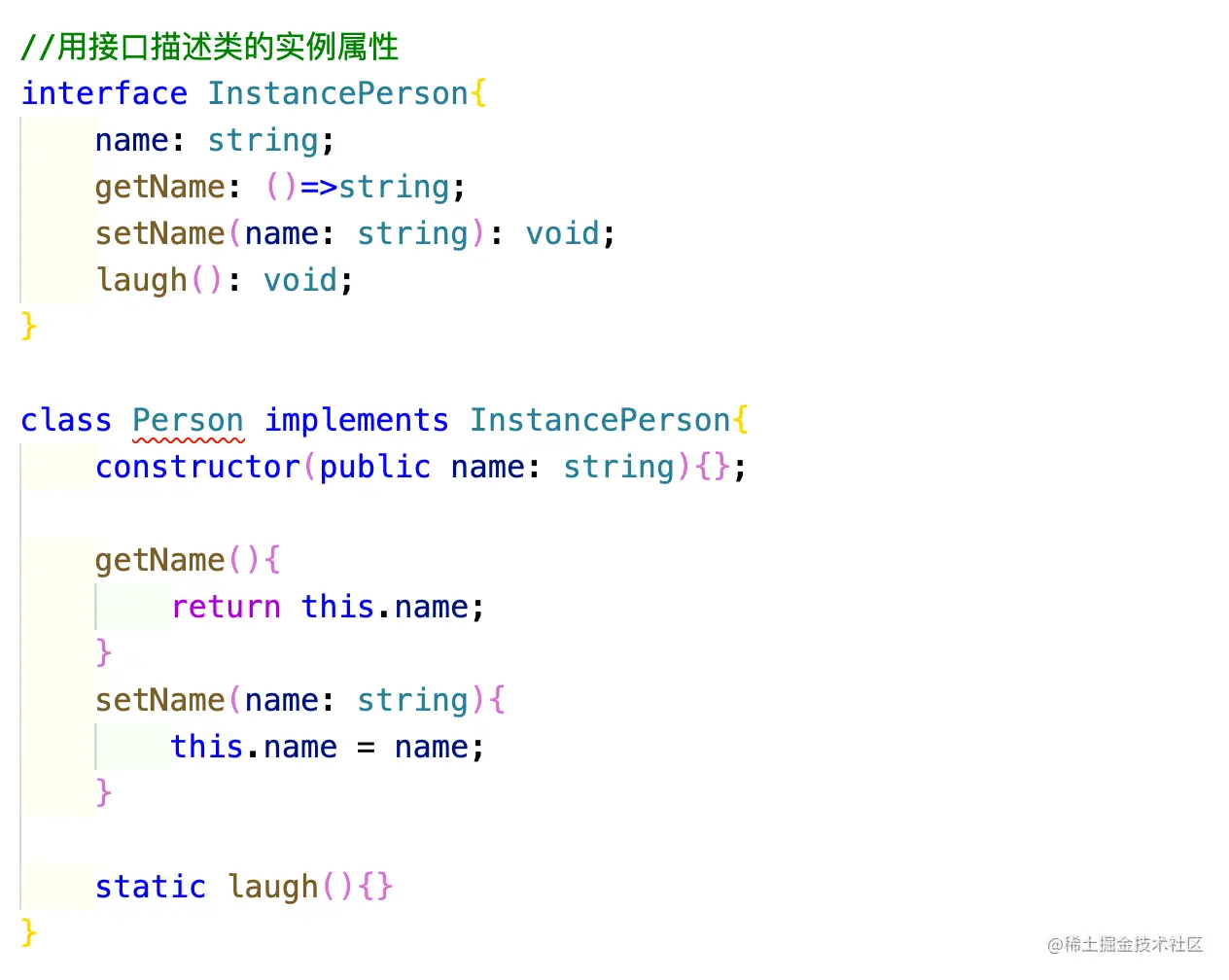 InstancePerson里面添加laugh属性的约束,那么当Person类实现该接口时, TS就会要求Person类去重新实现laugh的方法,并且会忽略已经存在的静态方法laugh。
