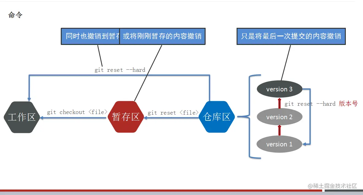 - 撤销,指的是将最后一次提交的内容撤销到暂存区、工作区;或者将刚刚暂存的内容撤销到工作区