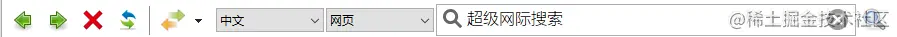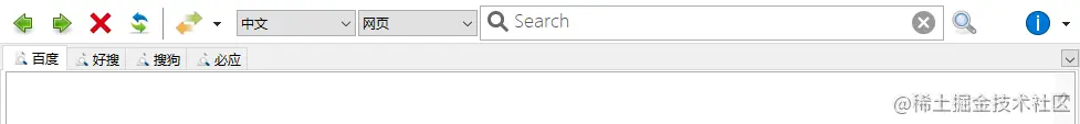 工具栏功能依次是:前进、后退、停止、刷新、切换模式、选择语言下拉列表框、选择搜索引擎下拉列表框、关键字输入框、搜索。