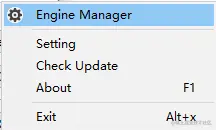 关于菜单包括如下功能:引擎管理工具、设置工具对话框菜单项、检查更新功能、关于对话框菜单项、退出。