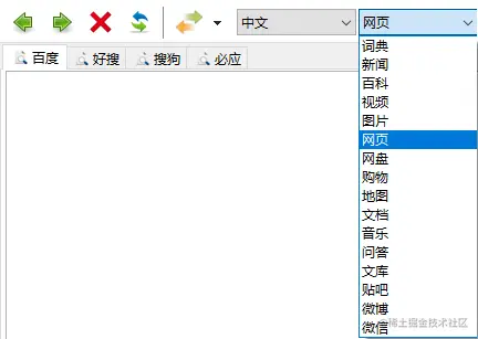 工具栏功能依次是:前进、后退、停止、刷新、切换模式、选择语言下拉列表框、选择分类下拉列表框、关键字输入框、搜索。