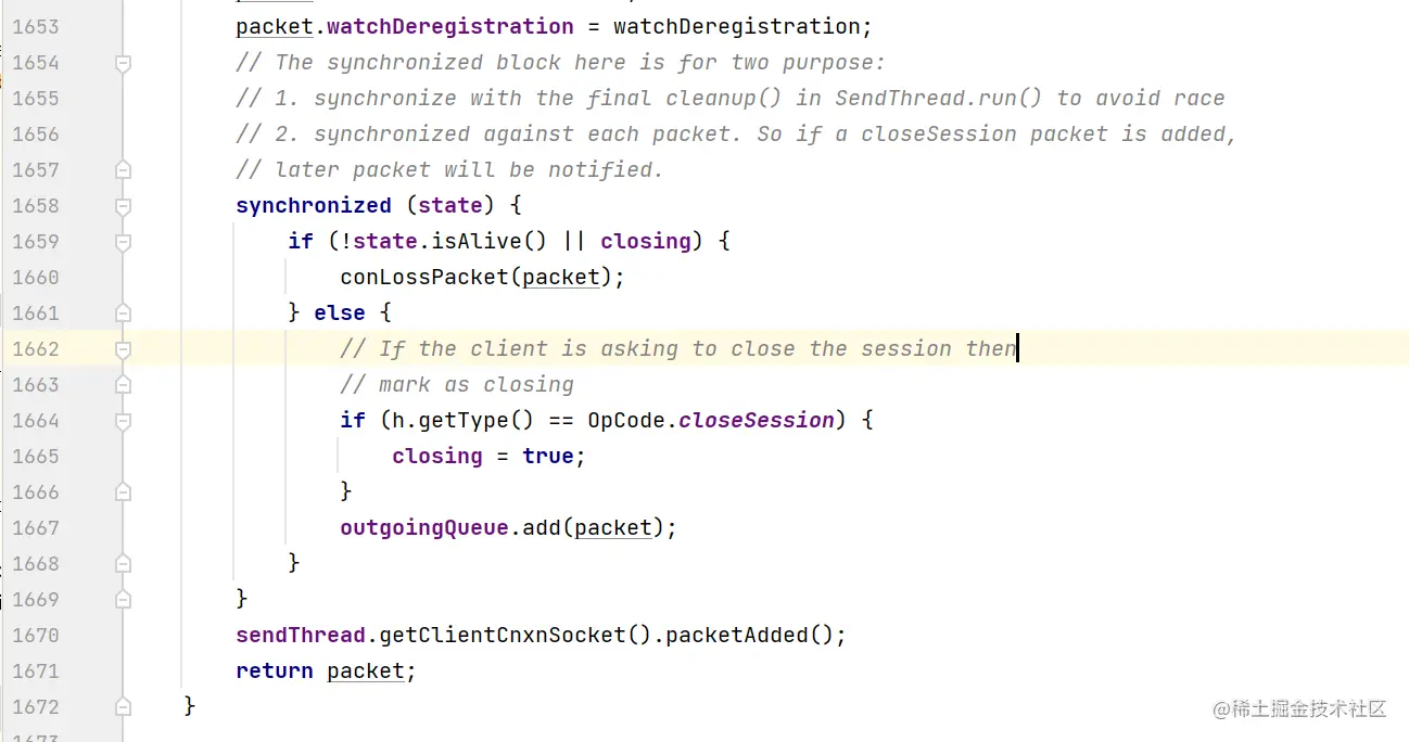 官方给该同步代码块解释是:这里的同步块有两个目的:1. 与 SendThread.run() 中的最终 cleanup() 同步以避免竞争 2. 针对每个数据包同步。因此,如果添加了 closeSession 数据包,则会通知稍后的数据包;
