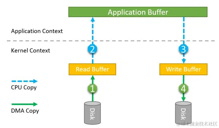 在上述过程中,发生了4次数据拷贝和4次系统上下文切换,其中第1次和第4次数据拷贝由DMA控制,不需要CPU参与,第2次和第3次需要CPU的参与。