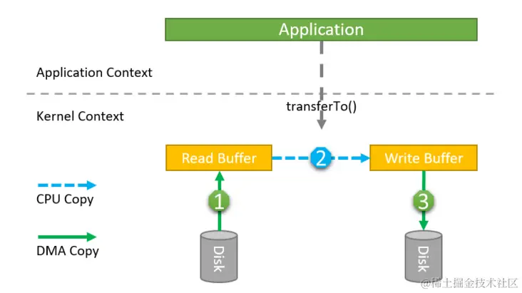 - transferTo方法调用触发DMA引擎将文件上下文信息拷贝到内核缓冲区。