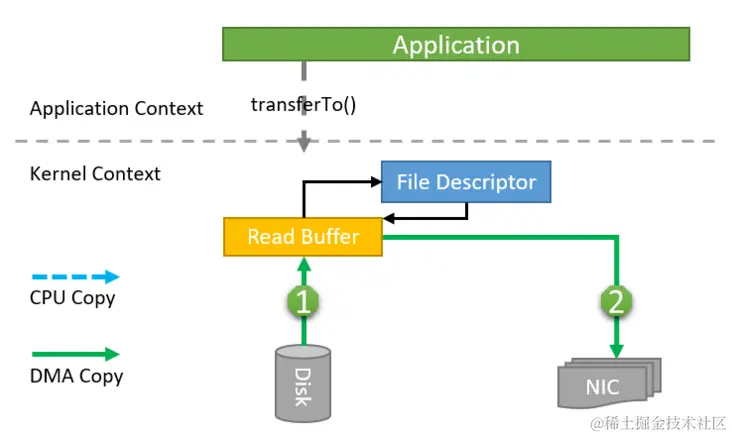在Linux 2.4以及更高版本的内核中,Socket缓冲区描述符支持gather操作。内核只向Socket传递数据的FD(File Descriptor),而不实际拷贝数据,这种方式不但减少上下文切换,同时消除了需要CPU参与的数据拷贝过程。