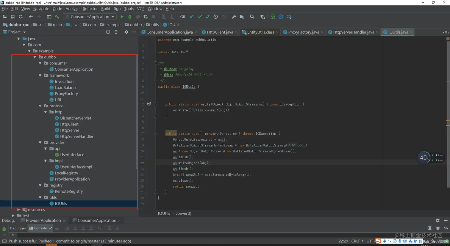 v1.0版本实现了服务消费者能够调用服务提供者的目标接口方法,通过文件实现共享服务地址列表。