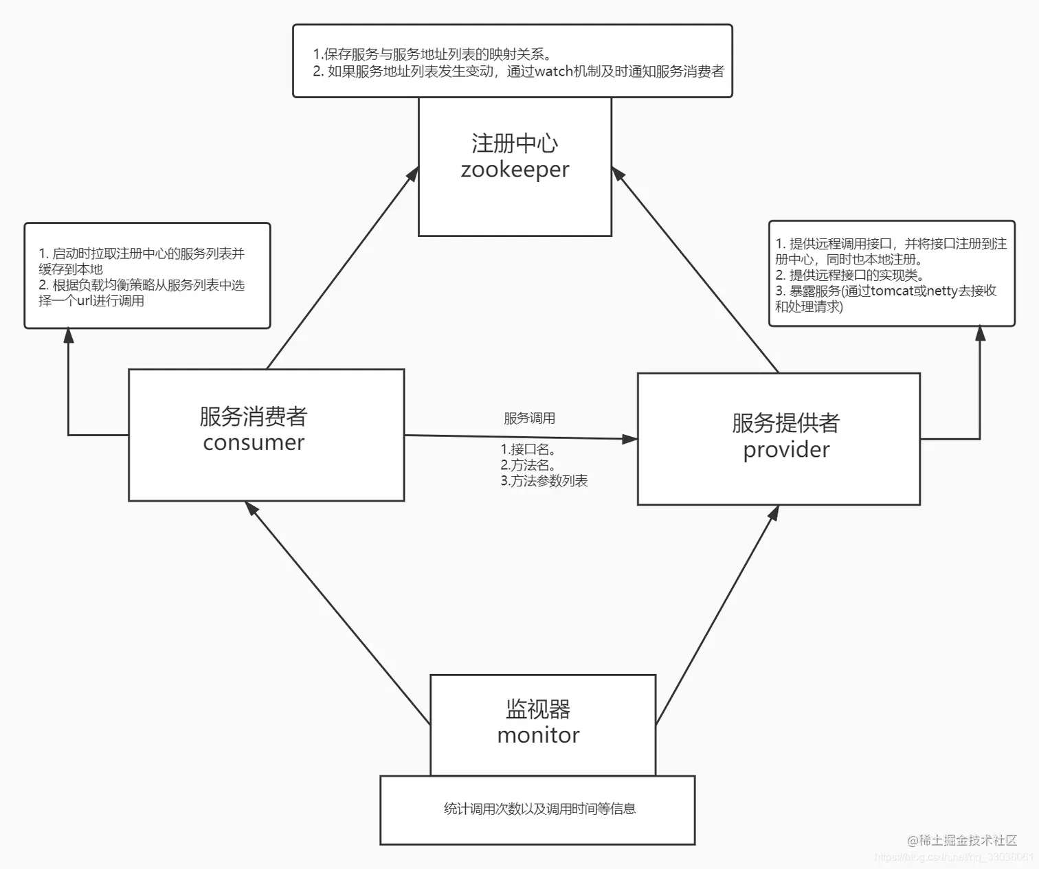 - 注册中心: 提供服务发现与注册功能, 如果服务发生变动通过watch机制通知服务消费方。