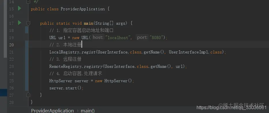 本地注册的用处是在启动的时候用来缓存,在处理请求的时候会用到,根据接口的全限定名获取到实现类的Class, 当服务消费方把请求的目标接口的方法名和方法参数列表发过来后就可以获取到method对象, 然后通过method对象在服务提供方执行目标方法。