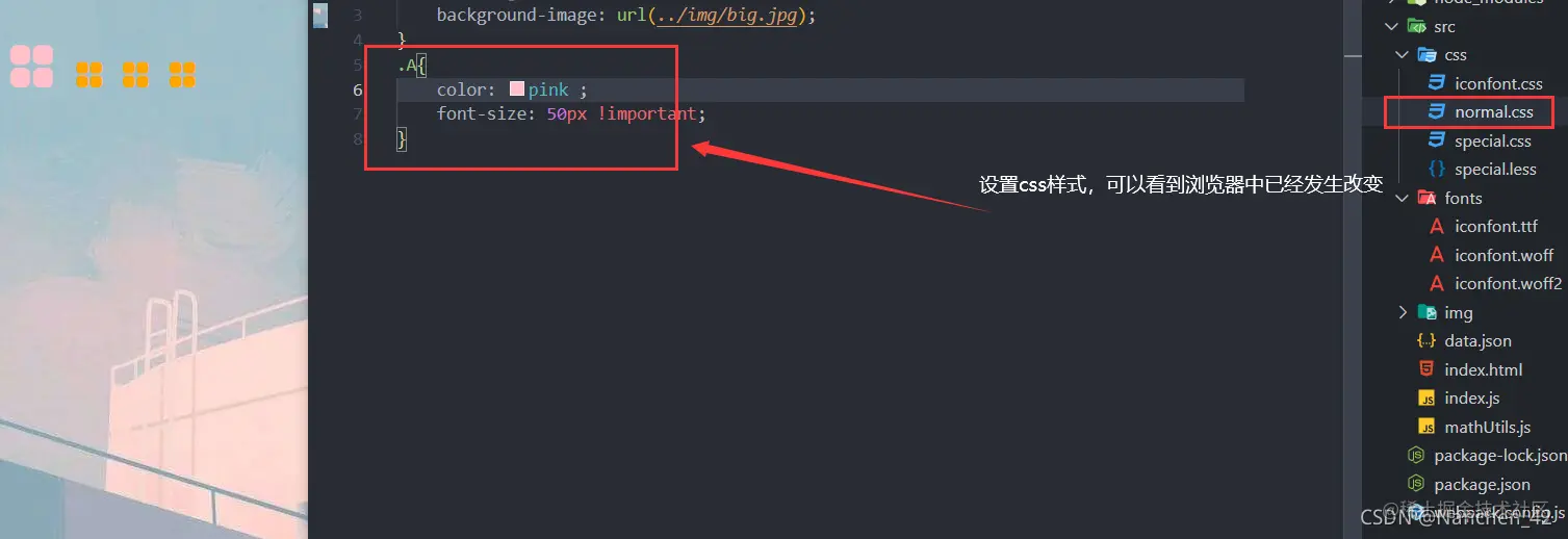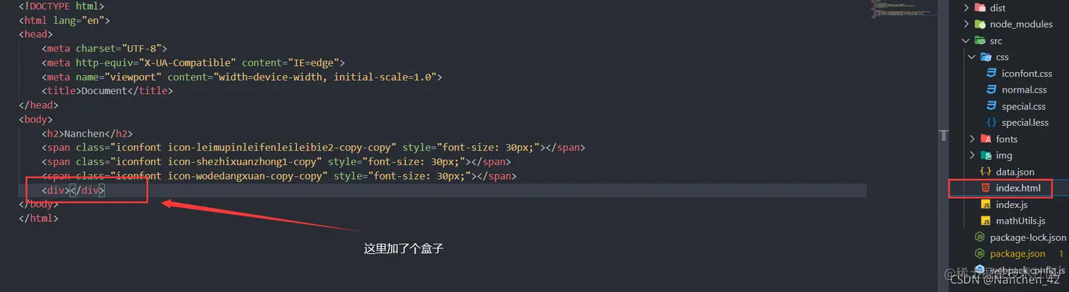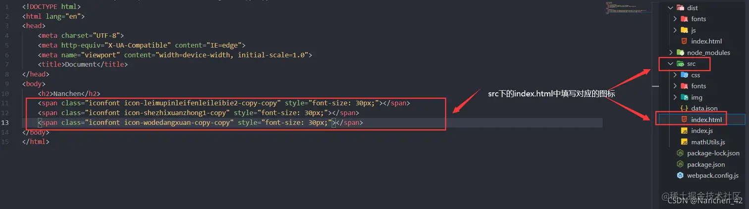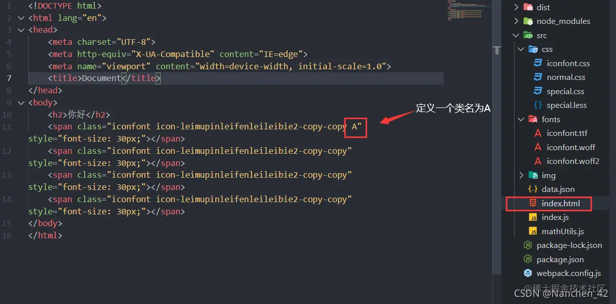在src中添加一个index.html文件(之前忘了说,这里给补上) 并写入字体样式以及类名
