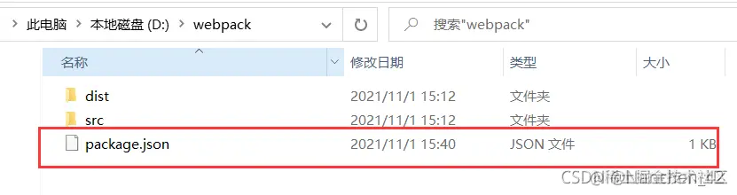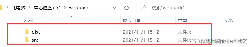 首先呢先随便选个盘创建一个文件夹为webpack(名字可以自己定义),在文件夹中添加两个新文件夹scr以及dist