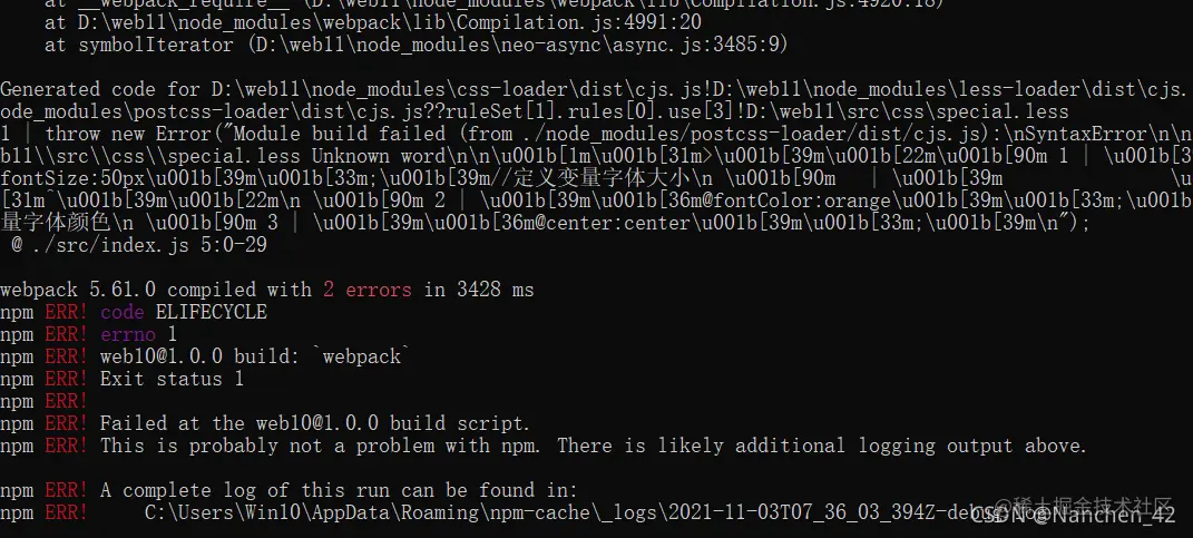 打包后会发现两个错误原因是less文件中没有把注释给去掉