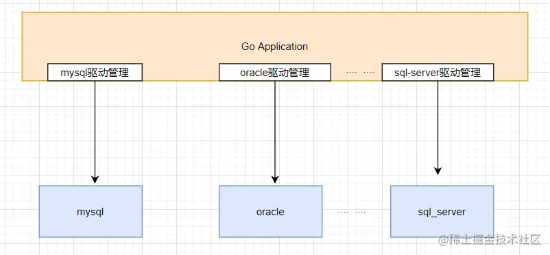 我语言(go语言)如果自定义一套标准的接口(上图database/sql),那么数据库厂商按照我这个提供的这个接口写一个驱动来适配这个接口(这个接口可以与go程序进行交互),那么语言只要制定一套标准不显得臃肿,程序员也可以只要掌握这个接口的使用就可以了(矛盾转移,将任务堆给数据库厂商)