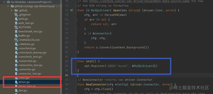 但是一般情况下我们在导入包 mysql驱动的时候(其他驱动也同理),这个驱动包会有一个init 函数自动执行,执行这个init 函数的时候就进行了自我的注册,也就是调用了上述的sql.register 函数