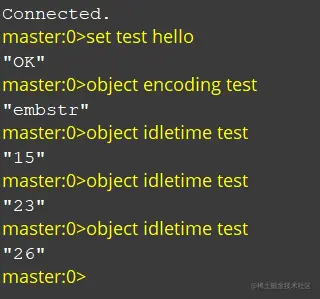 通过对比lru时间与系统当前时间,可以计算某个对象的在Redis中存在了多长时间,使用object idletime 即可看到(注:单位是秒),如下所示: