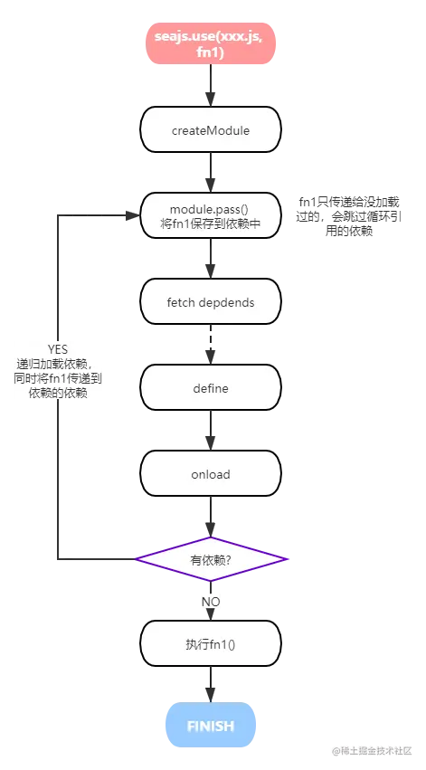 而seajs由于不需要执行父模块,最终需要执行的就只有入口的那个函数(seajs.use(xxx, function)),所以通过将回调传递到未加载的子依赖中,等子依赖执行完了直接调用即可。