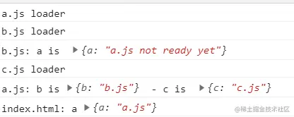 b.js的时候,此时已经记录了[main.js, a,js],但发现b.js的依赖a.js已经被递归过了,但没激活,那么直接取a.js.exports的值给b.js去执行(由于未初始化完成a.js.exports是undefined),接着回到步骤5,最终的输出结果: