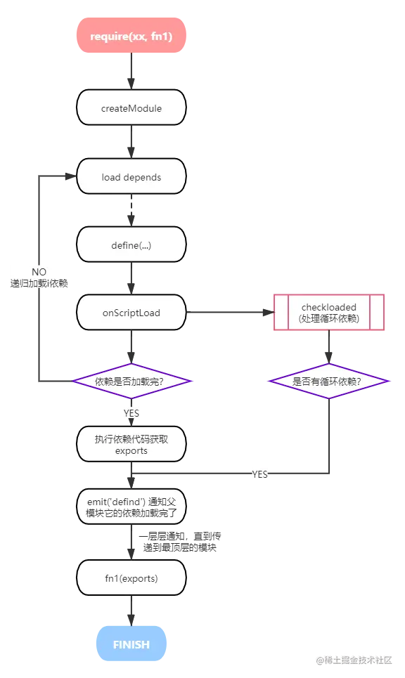 module.exports中,并且将执行完的模块保存到全局变量defined中,然后从enabledRegistry中删除自己,然后以模块id为事件名发布这个模块已经完成的事件 - 父级模块收到子模块加载完成的事件后,会判断所有依赖