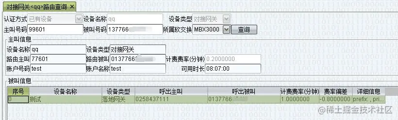 1.点击查询可以看到该通话经过的对接网关名称和计费的账户,可用时长等信息路由主叫和路由被叫是经过对接网关号码规整之后的号码。