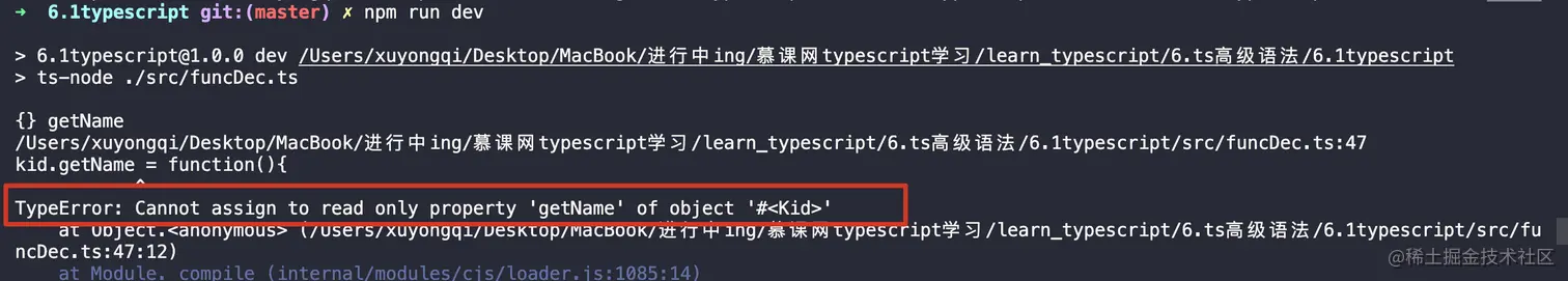代码中通过kid.getName = ()=>...对getName进行了重写,但是在装饰器中,存在descriptor.writable = false---就是🈲重写,从而报错