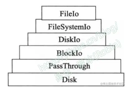 如图1,展示了文件系统构建的各级栈的结构。各层不断的屏蔽硬盘读写的细节,最终构建出对文件系统访问的Protocol。