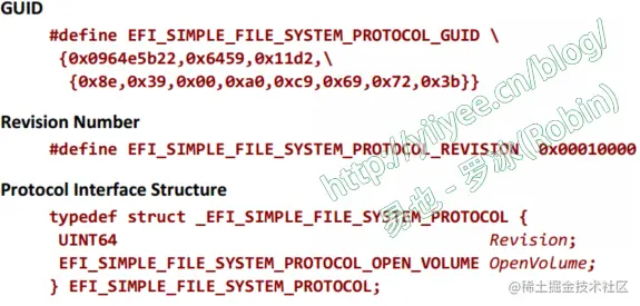 在UEFI Spec中,为EFI_SIMPLE_FILE_SYSTEM_PROTOCOL提供了GUID,可以通过LocateProtocol等函数找到其实例。而EFI_FILE_PROTOCOL的实例不是由GUID来定位的,而是通过EFI_SIMPLE_FILE_SYSTEM_PROTOCOL的函数OpenVolume获取的。