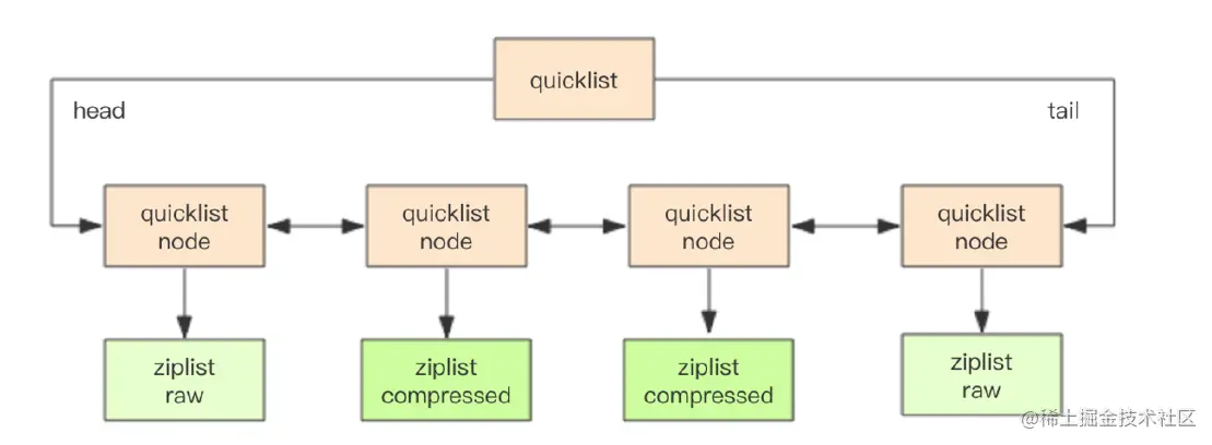 上述代码简单地表示了quickList的大致结构,为了进一步节约空间,Redis还会对zipList进行压缩存储,使用LZF算法进行压缩,可以选择压缩深度。