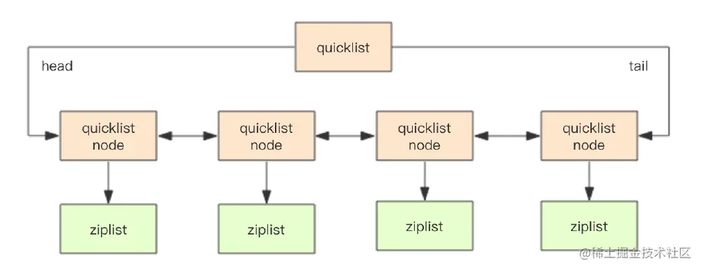 在Redis3.2版本之后,list的底层实现方式又多了一种,quickList。qucikList是由zipList和双向链表linkedList组成的混合体。它将linkedList按段切分,单个节点使用zipList来紧凑存储,多个zipList之间使用双向指针串接起来。示意图如下所示: