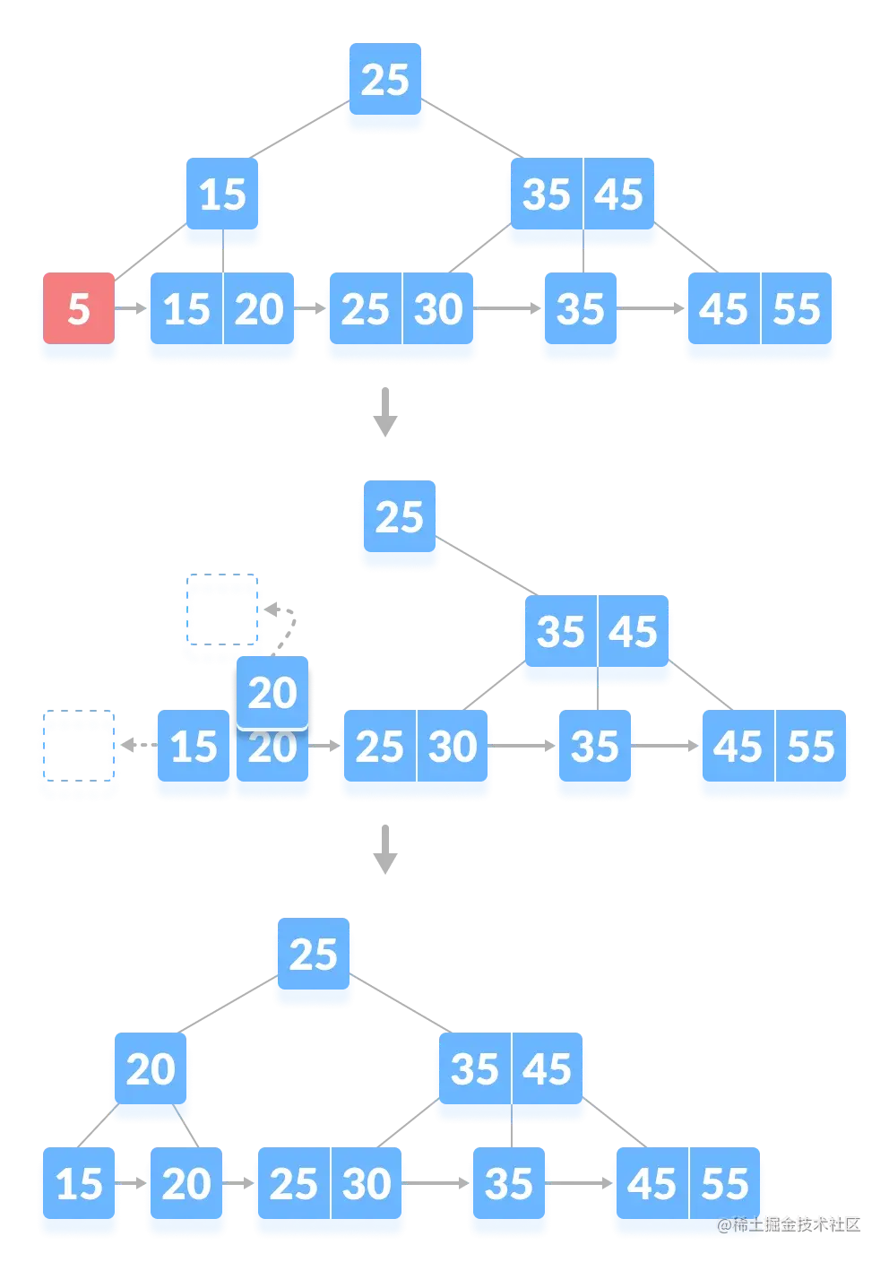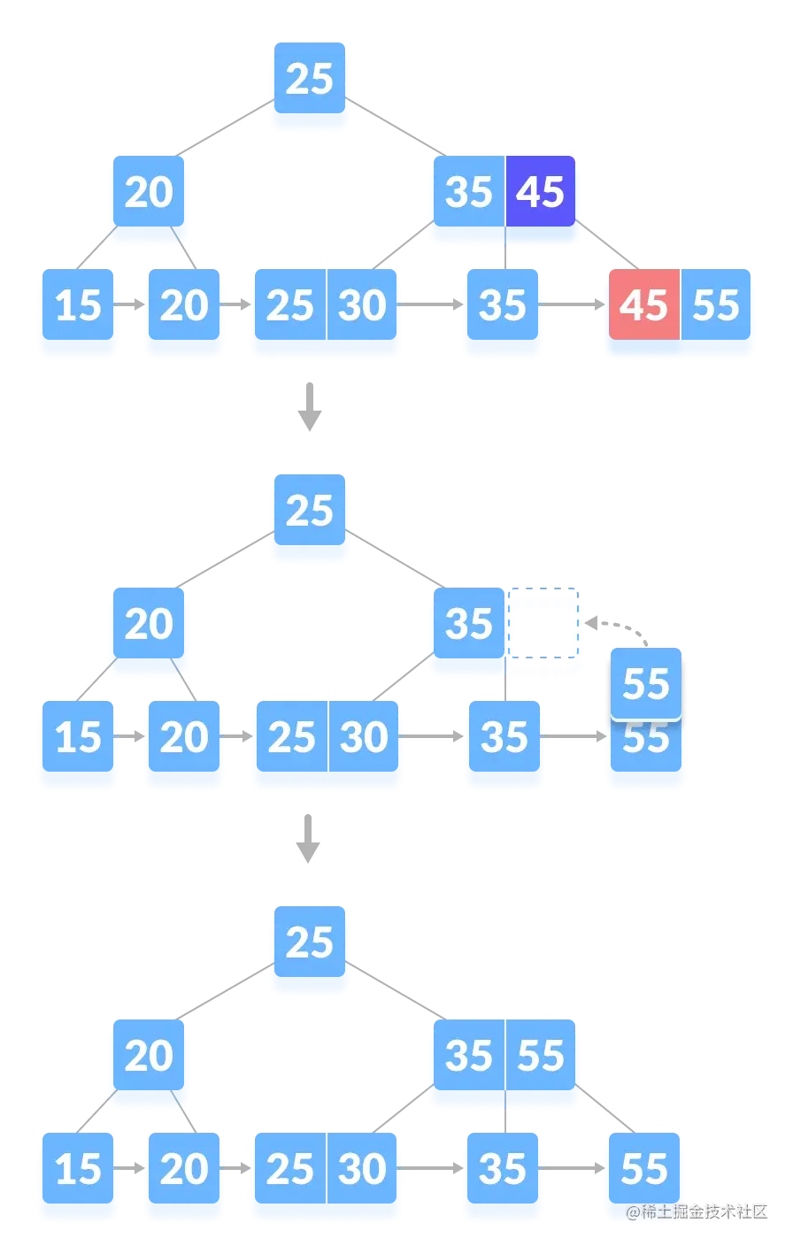 在这种情况下,树的高度会缩小。这有点复杂。从下面的树中删除 55 会导致这种情况。在下面的插图中可以理解。从 B-tree 中删除 55