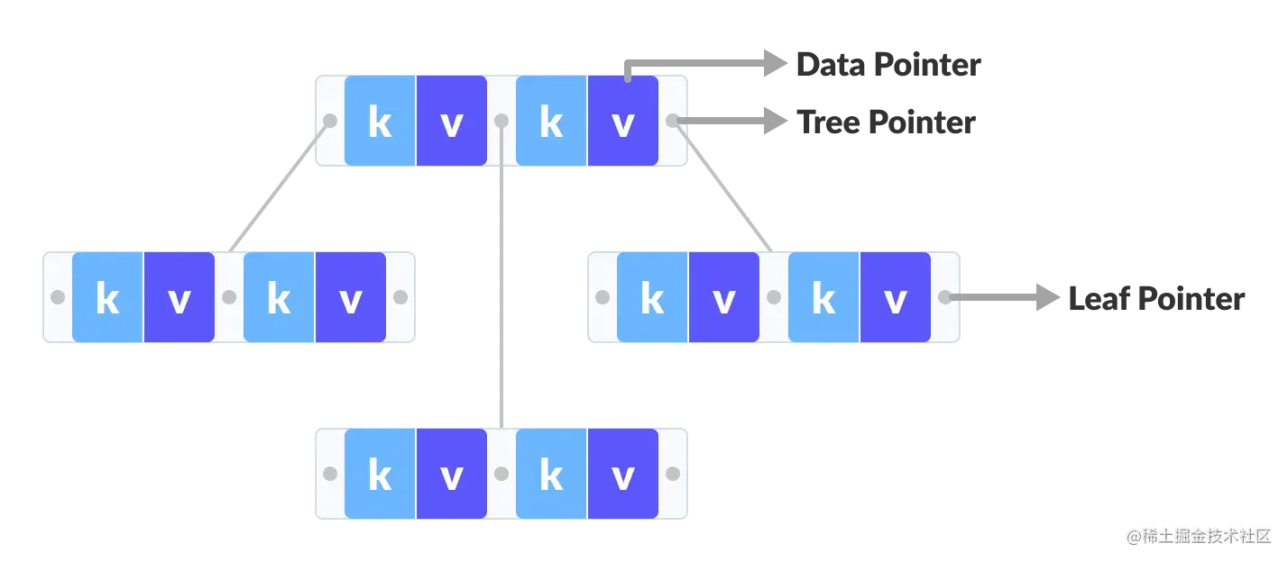 数据指针仅出现在 B+ 树的叶节点上,而数据指针出现在 B 树的内部、叶或根节点中。
