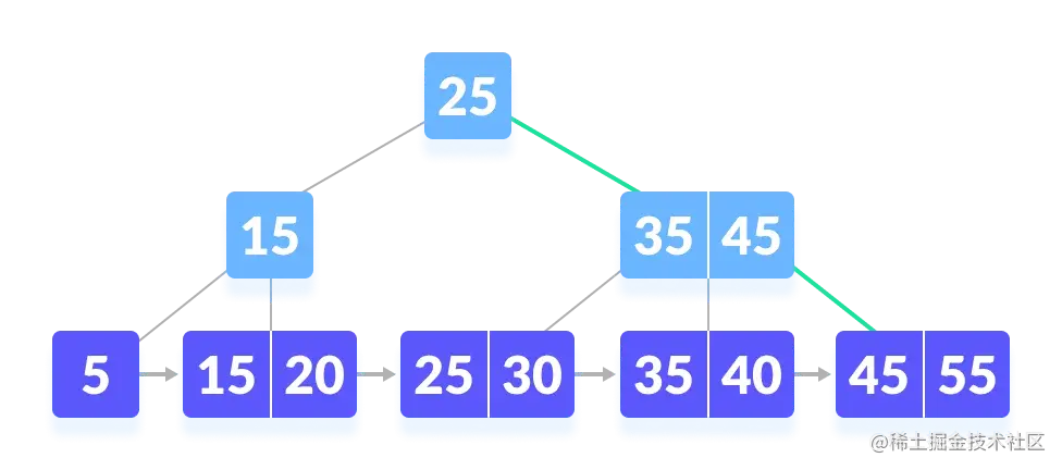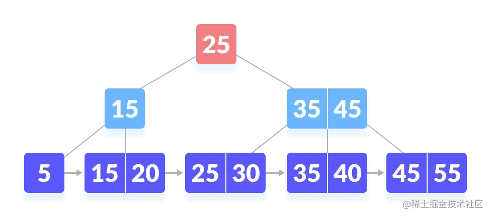 B+ 树是自平衡树的高级形式,其中所有值都存在于叶级中。