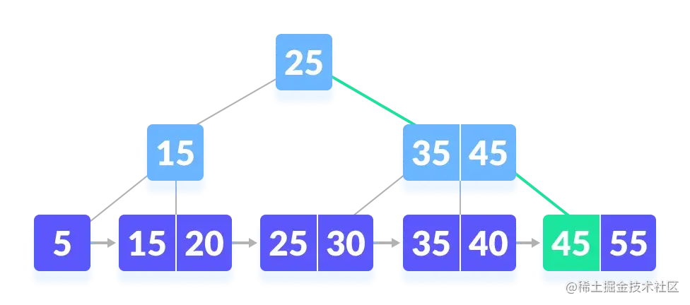 在下面的 B+ 树上搜索k = 45
