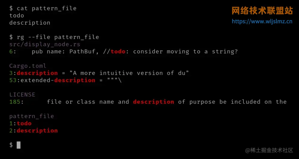 或者,您也可以使用“--file”选项,其中包含您要匹配的模式。当您定期搜索要匹配的一组模式时,您可以将其存储在一个文件中并使用“--file”选项指定它。