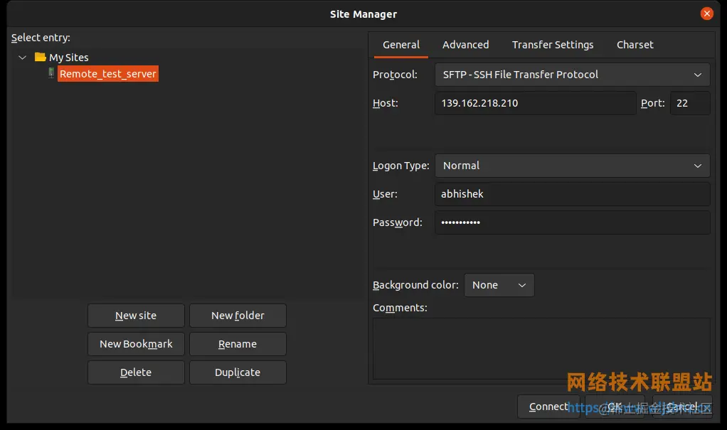 安装后,转到文件->站点管理器并添加远程系统详细信息,例如 IP 地址、SSH 端口号、用户名和密码。