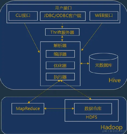 - 用户通过用户接口连接Hive,发布Hive SQL