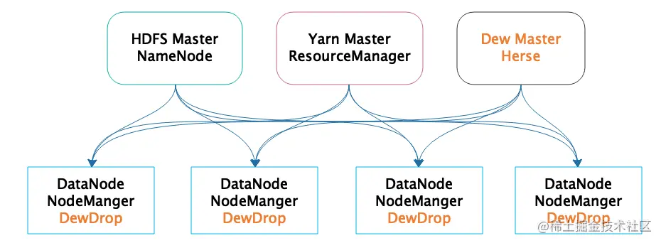 Herse独立部署一台服务器,而DewDrop则和HDFS的DataNode、Yarn的NodeManager部署在大数据集群的其他所有服务器上,即每台服务器都同时运行DataNode、NodeManager、DewDrop进程