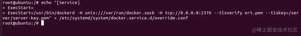 ExecStart=/usr/bin/dockerd -H unix:///var/run/docker.sock -H tcp://0.0.0.0:2376 --tlsverify --tlscacert=/server/ca.pem --tlscert=/server/server-cert.pem --tlskey=/server/server-key.pem" > /etc/systemd/system/docker.service.d/override.conf