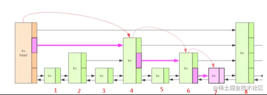 6节点所在的层,同理,6<7,且同层的下一个指针指向NULL,再下降一层; - 此时到了第一层,第一层是一个双向链表,由于