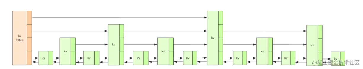跳表可以保证增、删、查等操作时的时间复杂度为O(logN),这个性能可以与AVL平衡二叉树相媲美,但实现方式上却更加简单,唯一美中不足的就是跳表占用的空间比较大,其实就是一种空间换时间的思想。跳表的结构如下所示:
