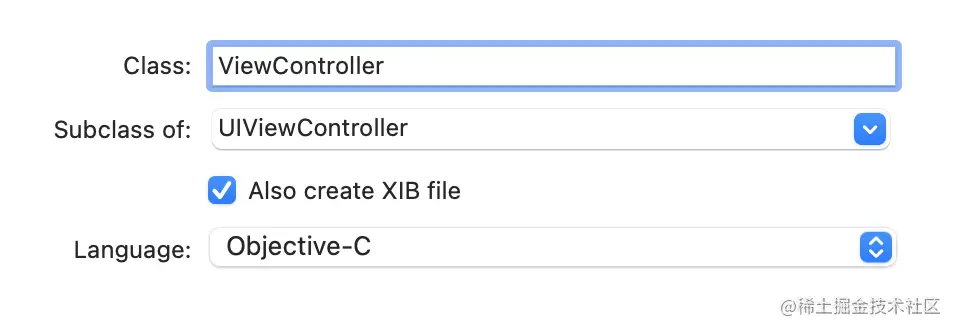 如果在创建控制器时选择了“同时创建xib文件”,如下图所示,则在创建该控制器时,直接使用 alloc] init] 就行了。可以这样理解,通过这种方式创建控制器的同时,创建了一个xib文件用来搭建此控制器的view。因此默认就是将该xib文件与创建的控制器是“绑定的”、“对应起来的”……